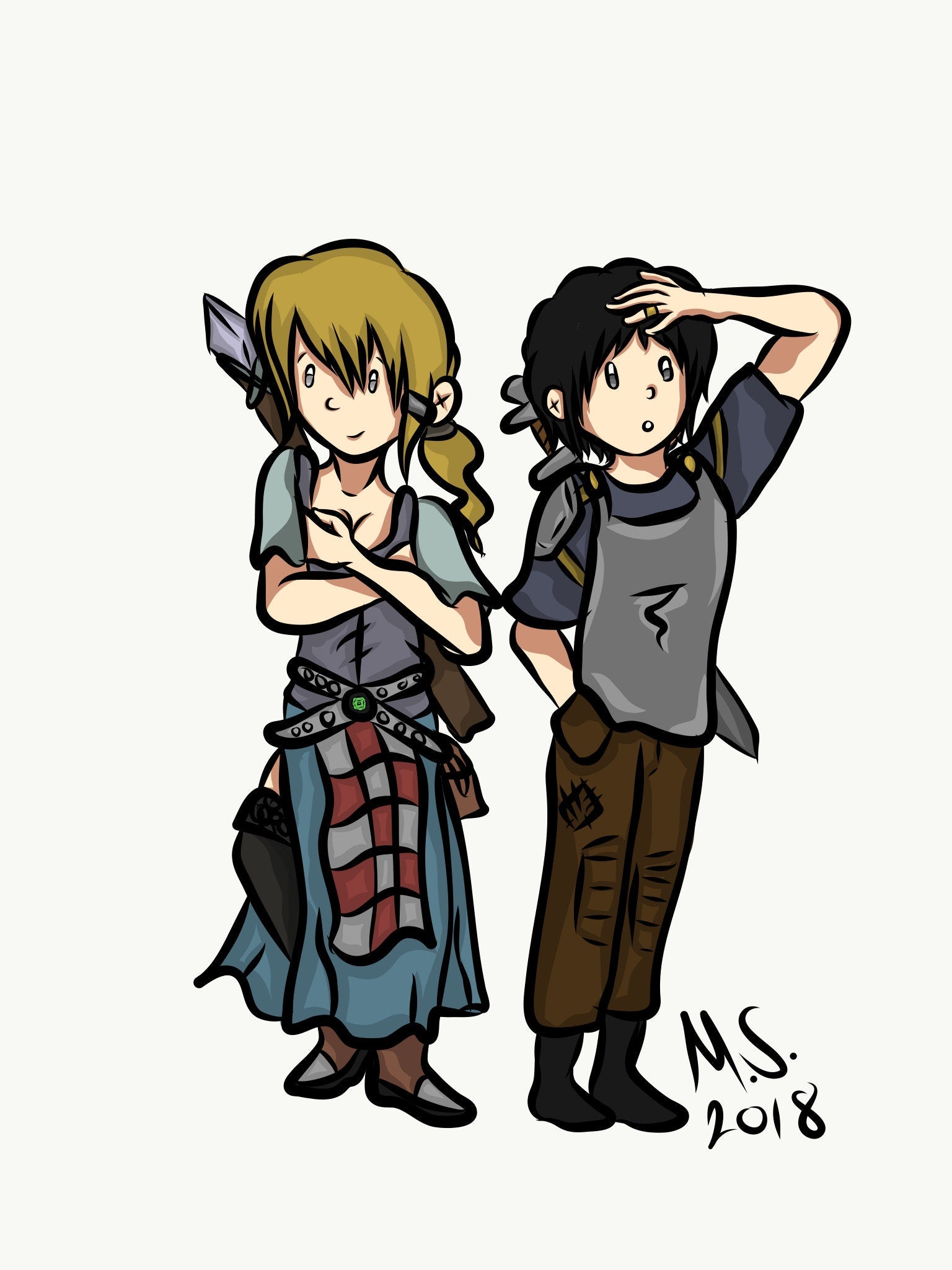 A mini holographic sticker of a mage and her follower off on an adventure...and maybe a bit lost.