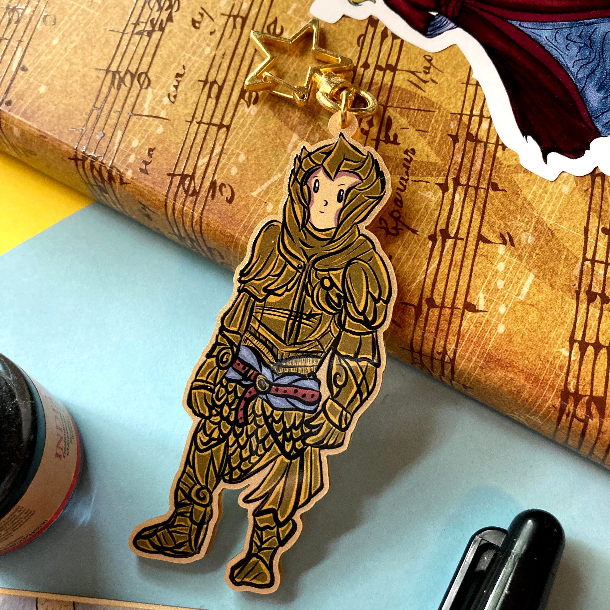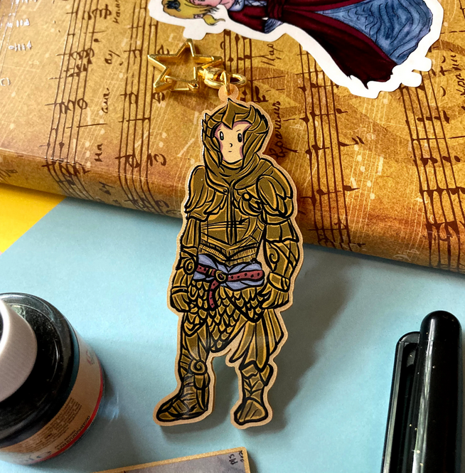 Made from recycled acrylic with a gold moon or star lobster clasp, this eco-friendly metallic gold keychain features a set of fantasy Heavy Armor.