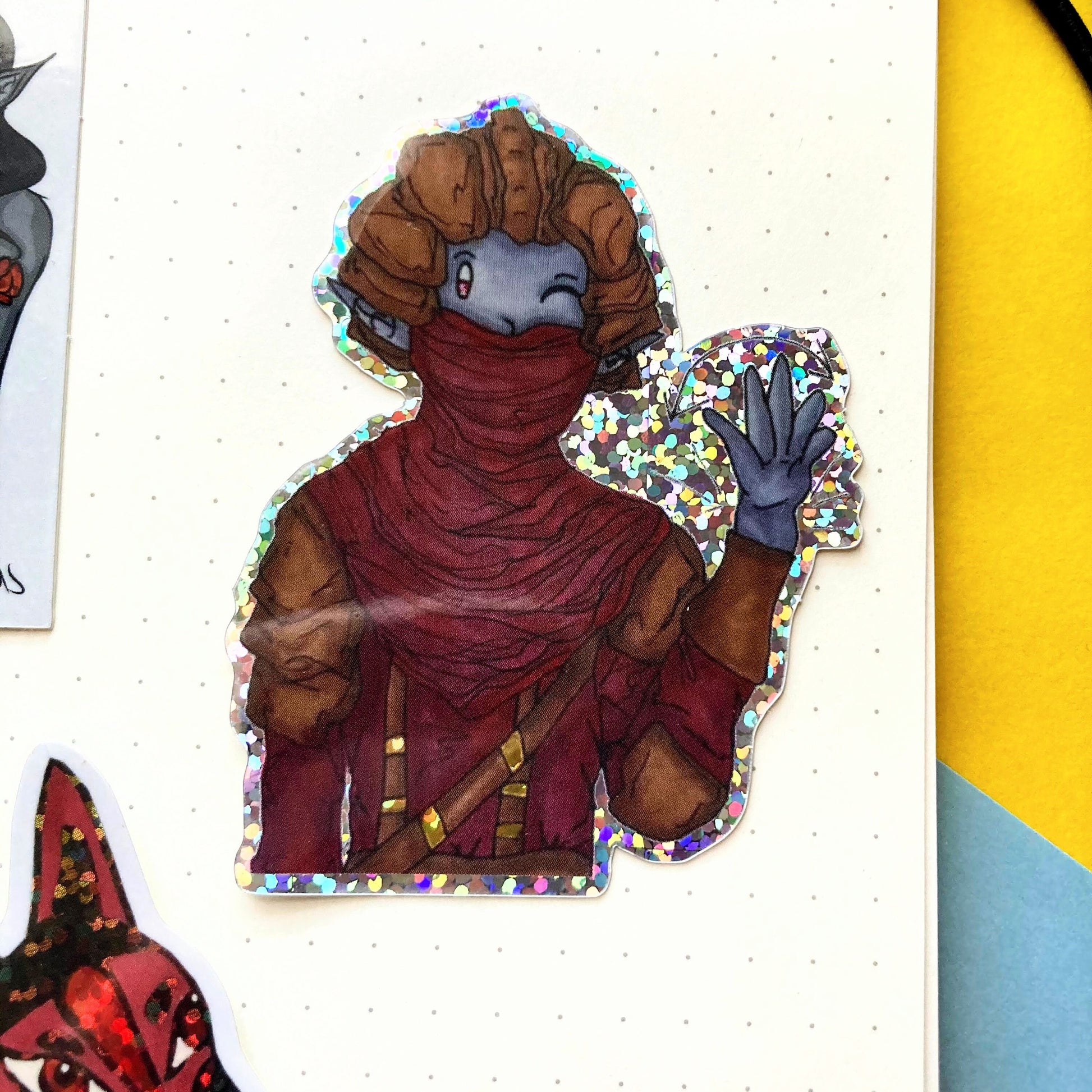 A glittery vinyl waterproof sticker of a waving dark elf mercenary.