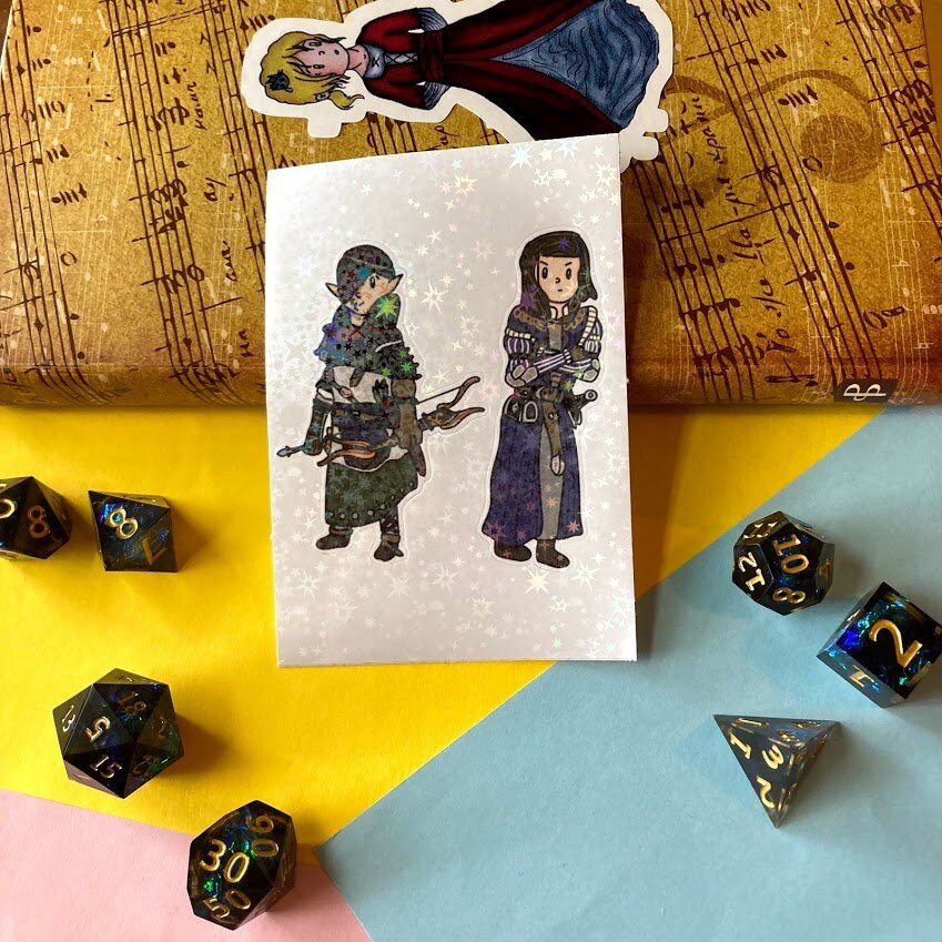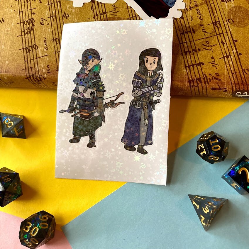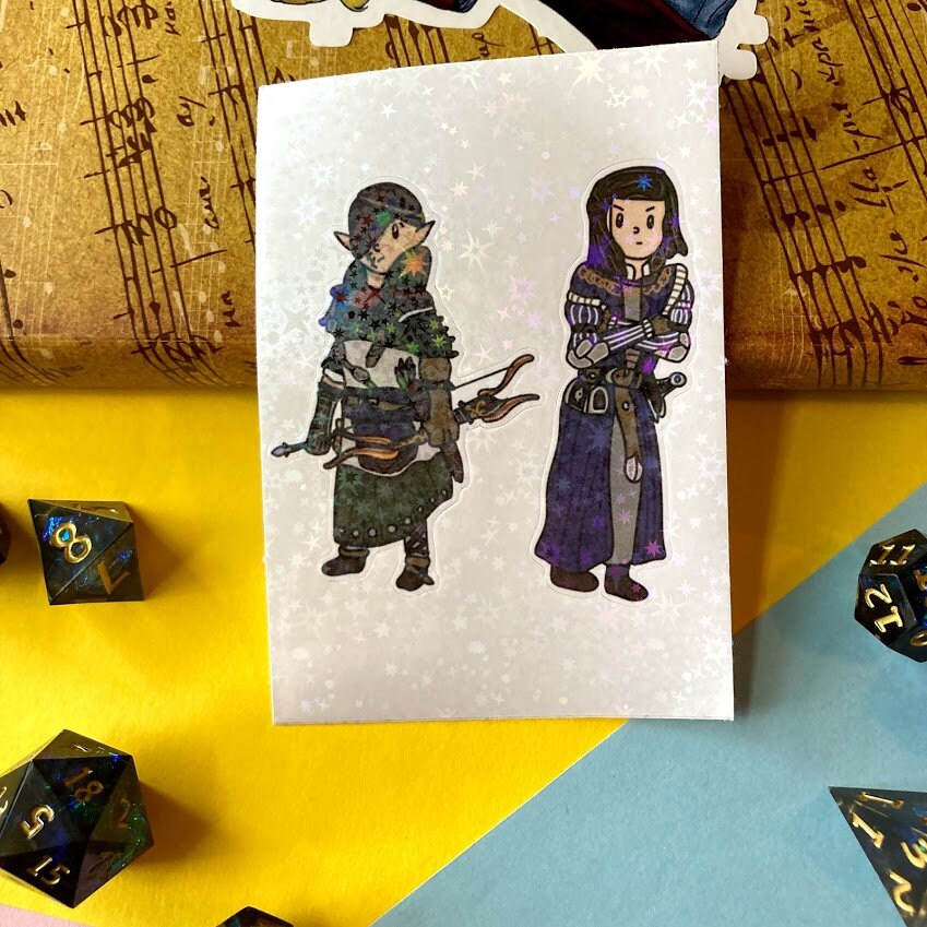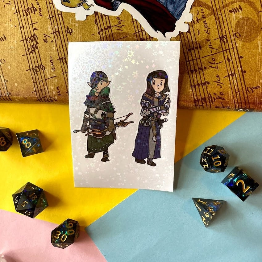 This sticker sheet features two stickers, one of the leader of the elves and one of the human special forces leader with a waterproof holographic star overlay.