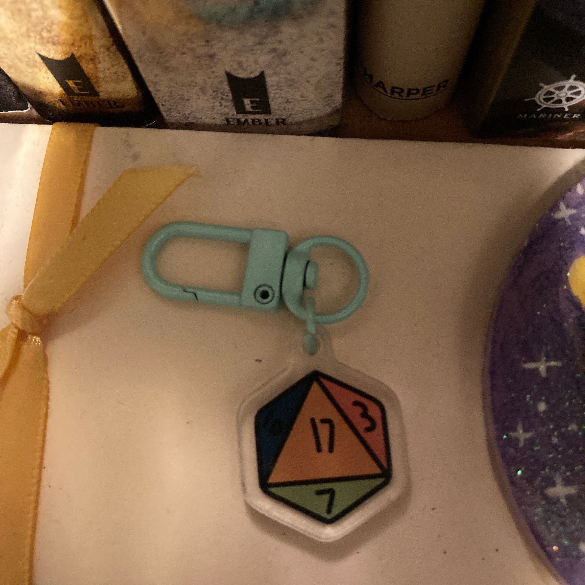 These mini 0.5” dice keychain is perfect for the ttrpg gamer and makes a great bag accessory or adaptive zipper pull for those who struggle with fine motor tasks and is made of printed clear acrylic with an easy to use teal metal clasp.