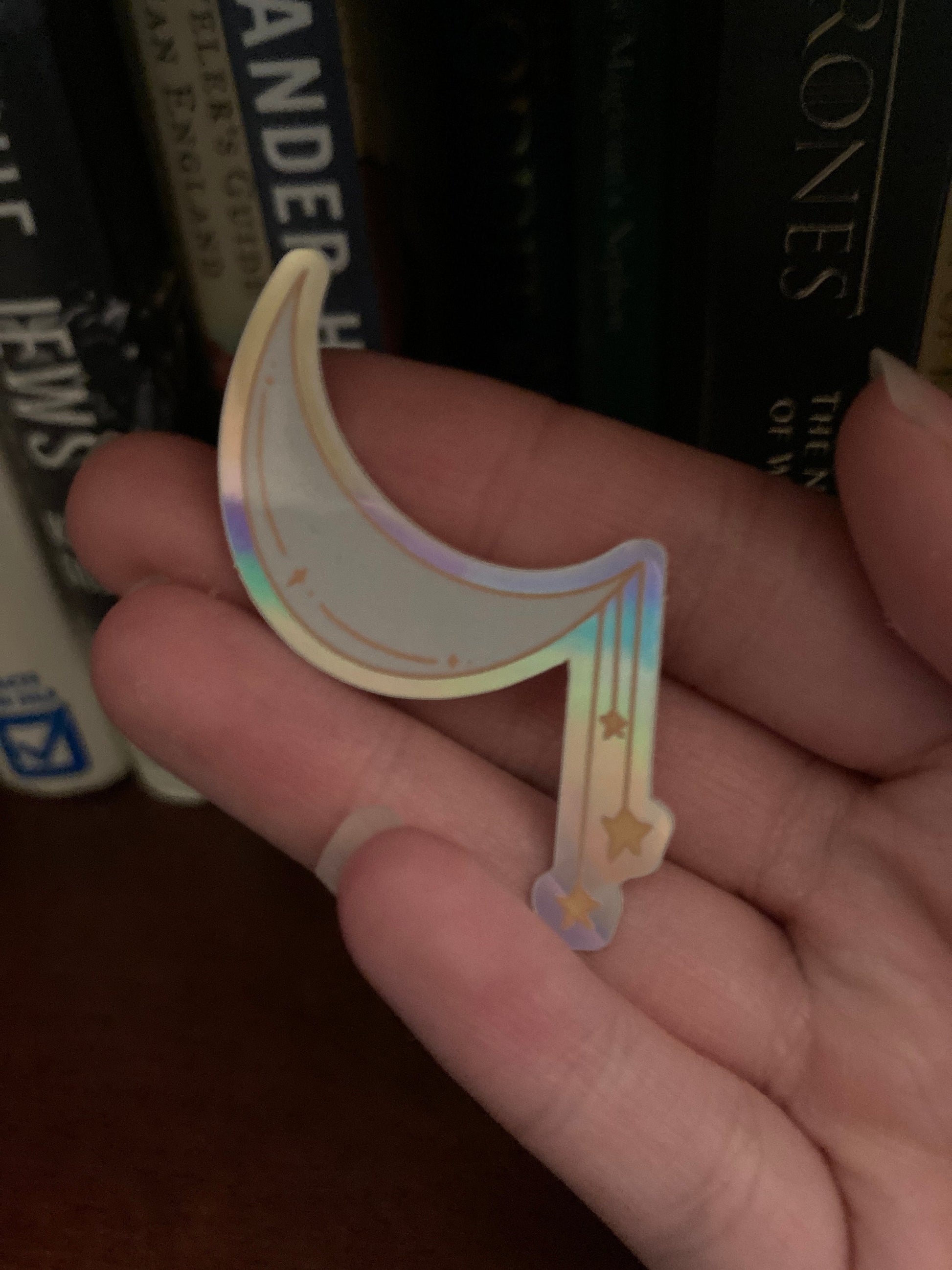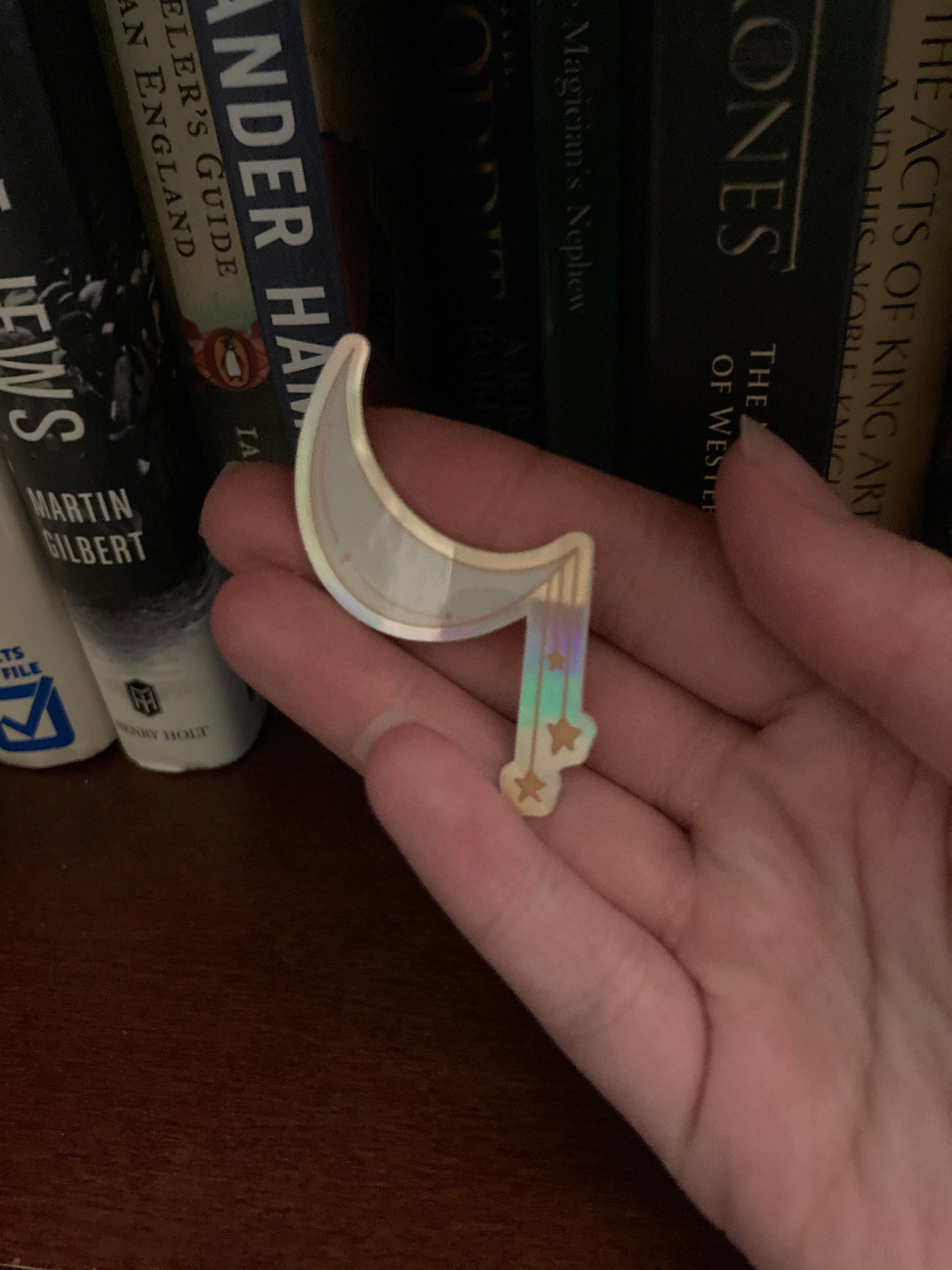 This holographic limited edition moon with hanging stars sticker is made of waterproof vinyl and is a perfect addition to any laptop, sketchbook, or water bottle.