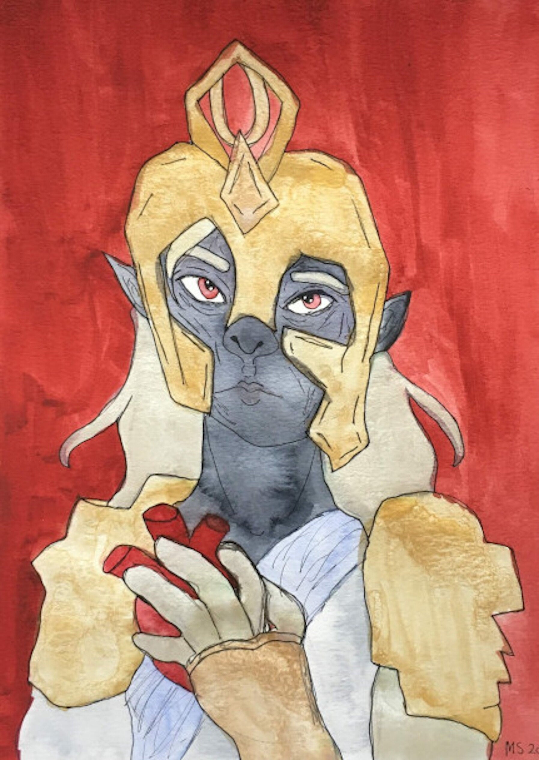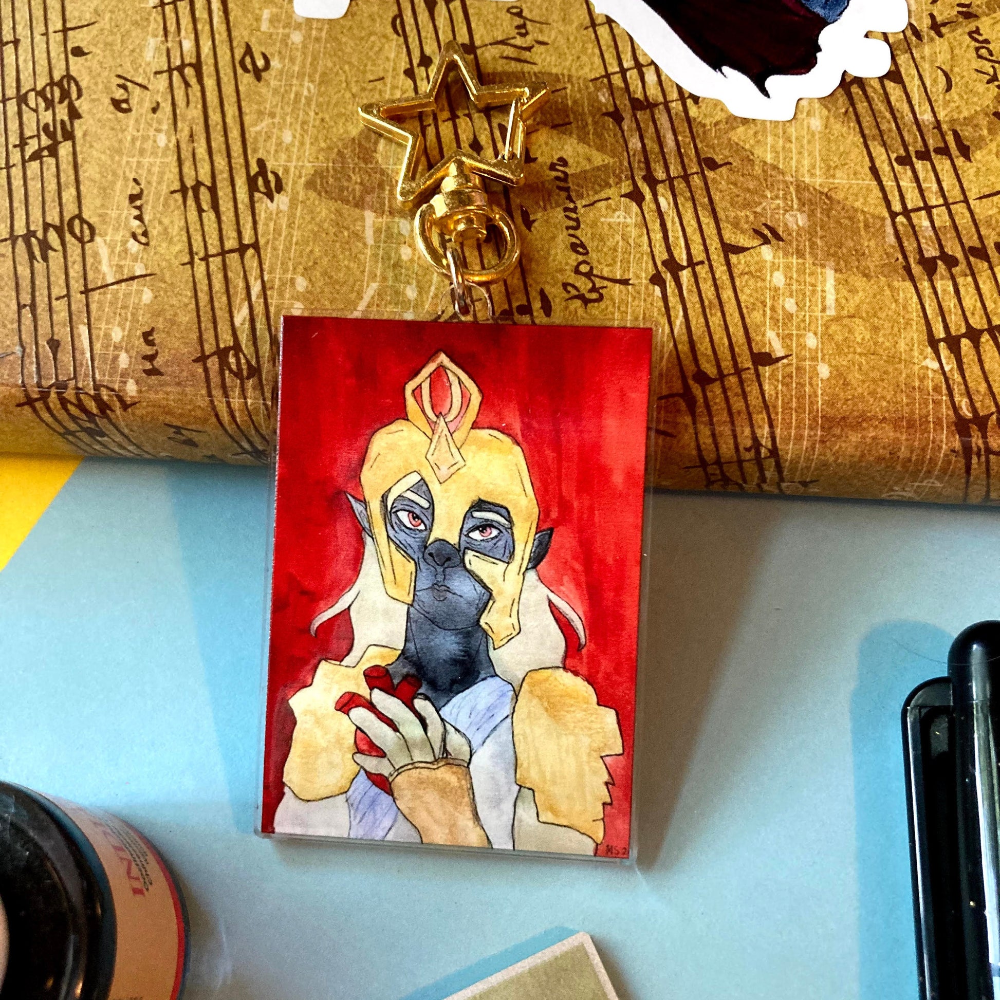 Made of eco-friendly recycled acrylic this keychain features a double sided print of a watercolor painting of the clock lord, in his wizard robes and helmet wirh the mechanical arm holding the heart that gives him power.