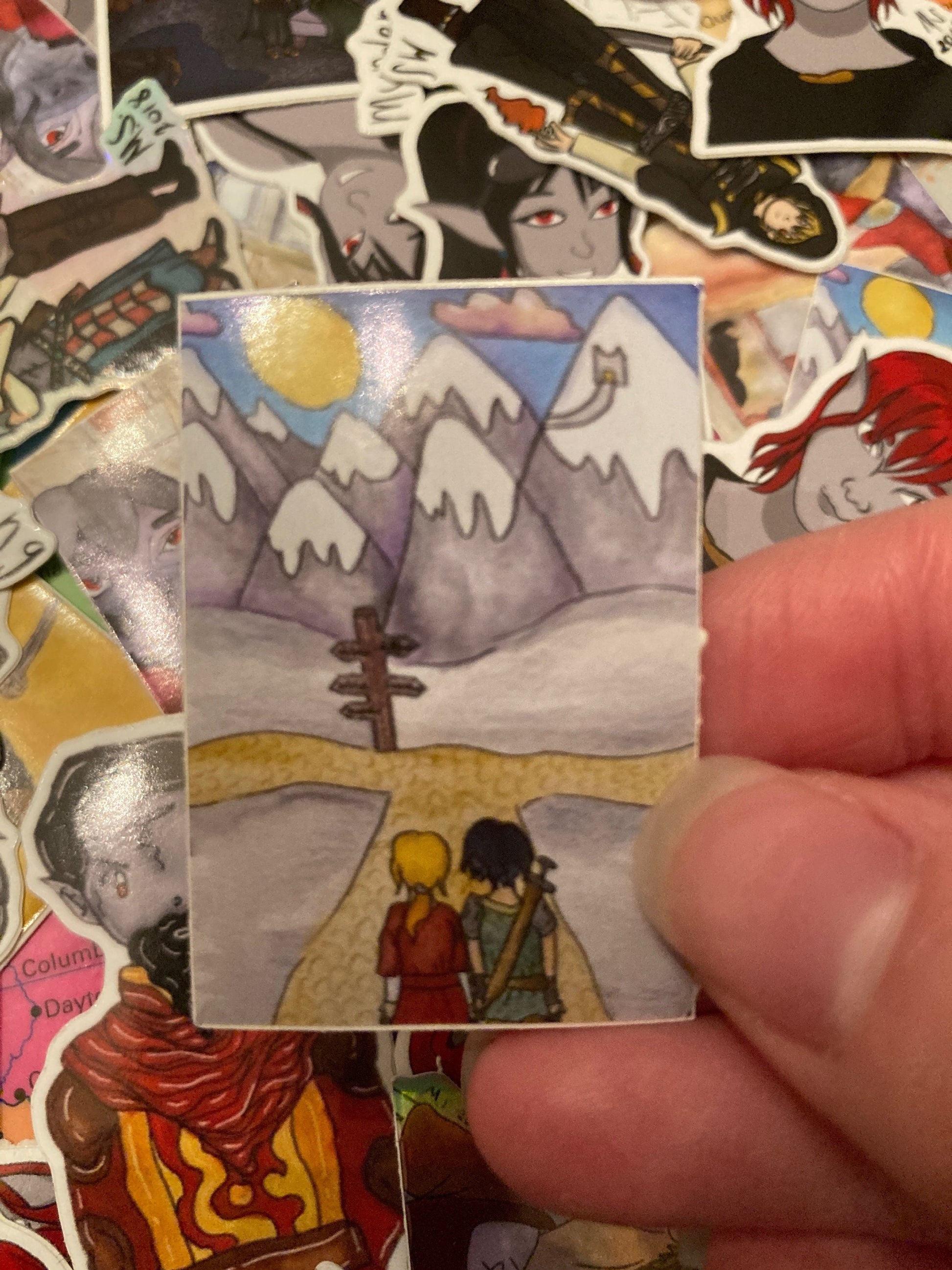 A mini vinyl sticker of a hero and their companion at the crossroads, it’s small size makes it perfect for adding a little bit of adventure inspired decoration.