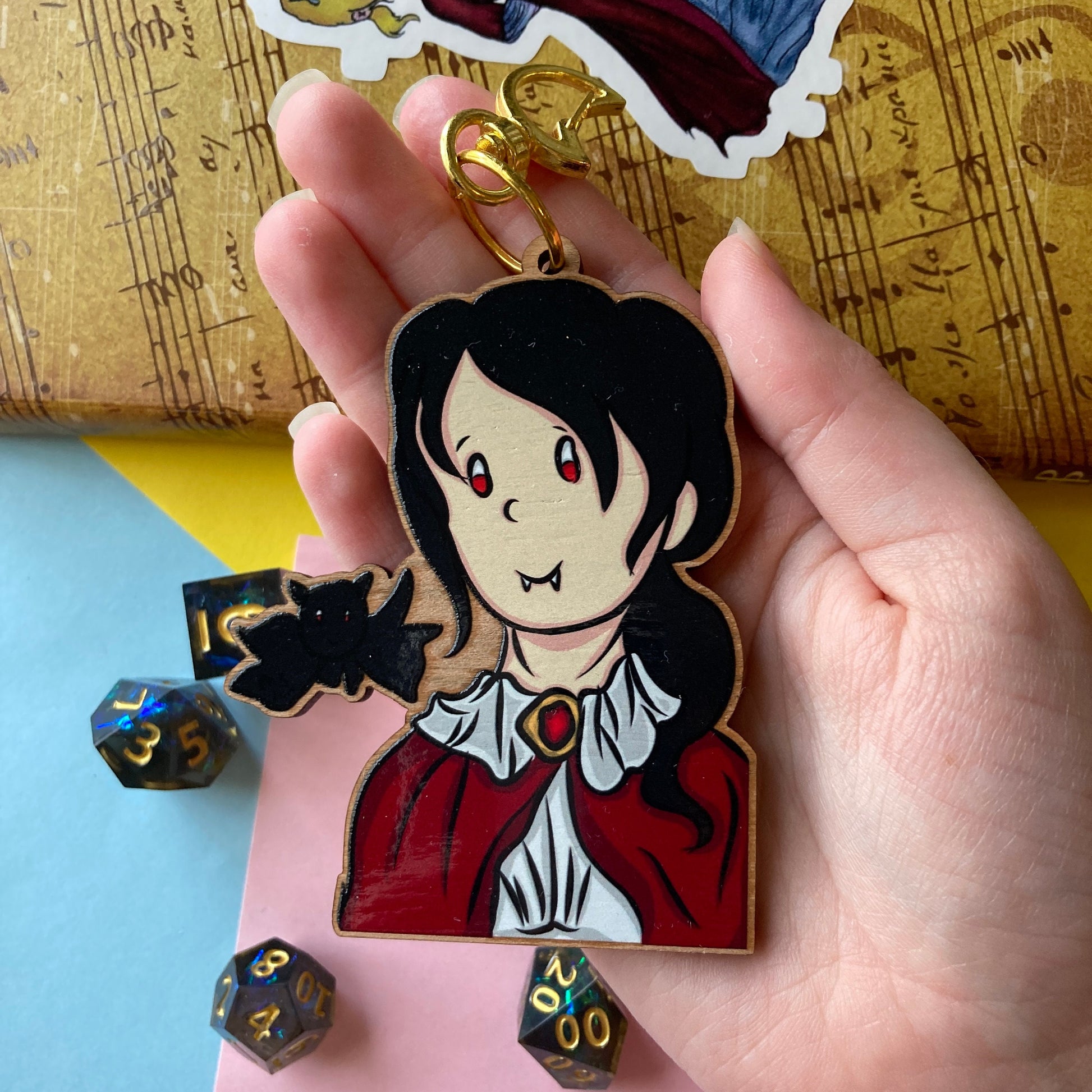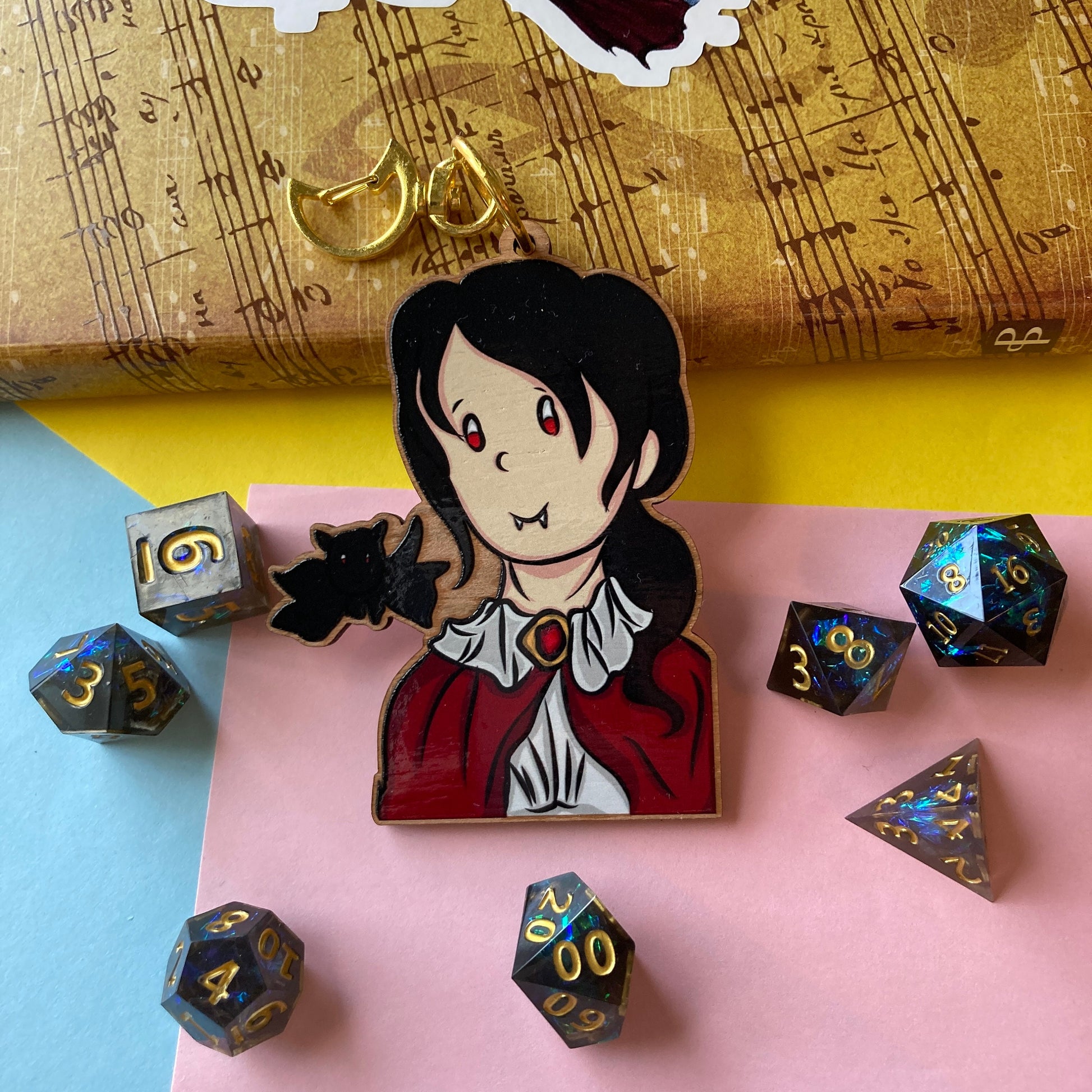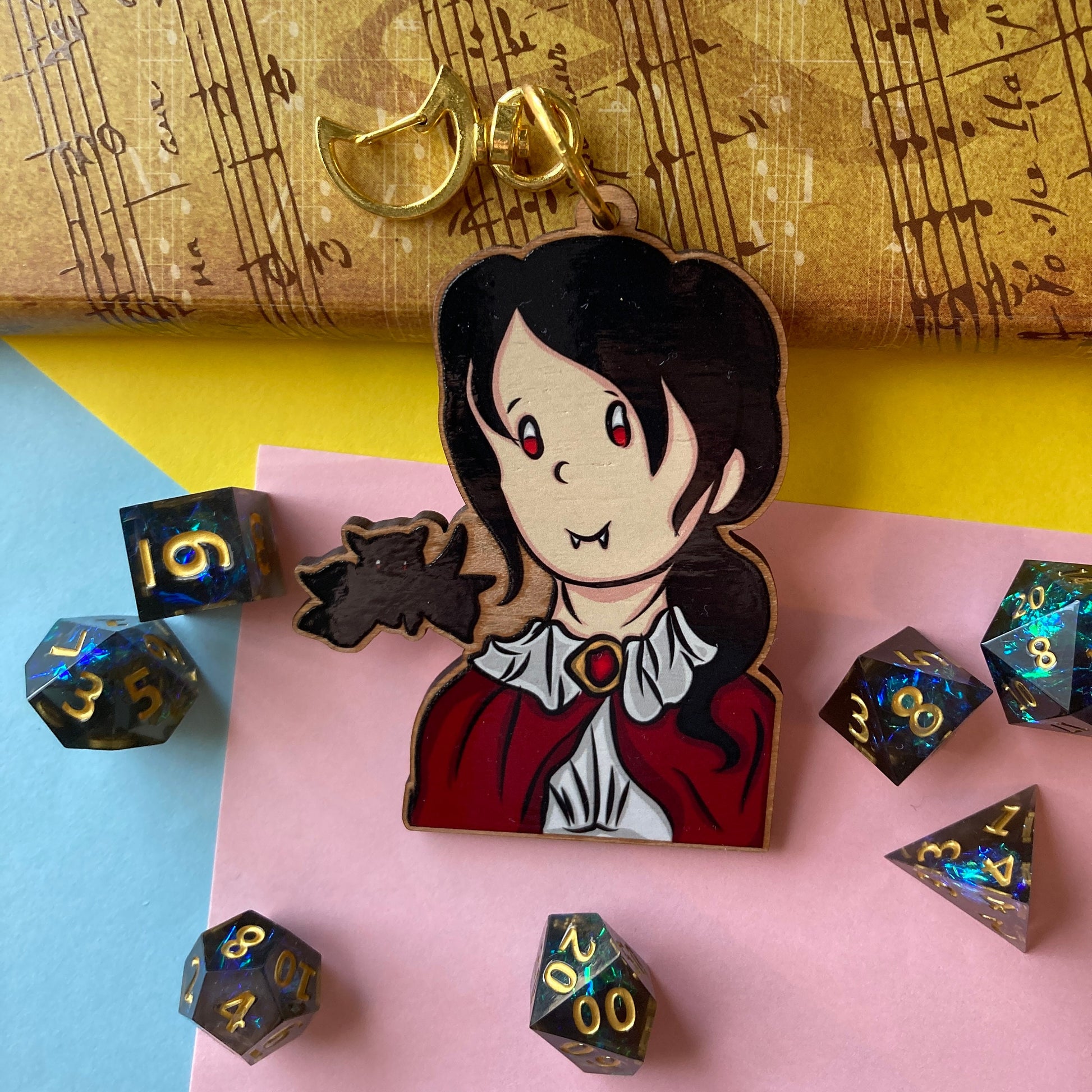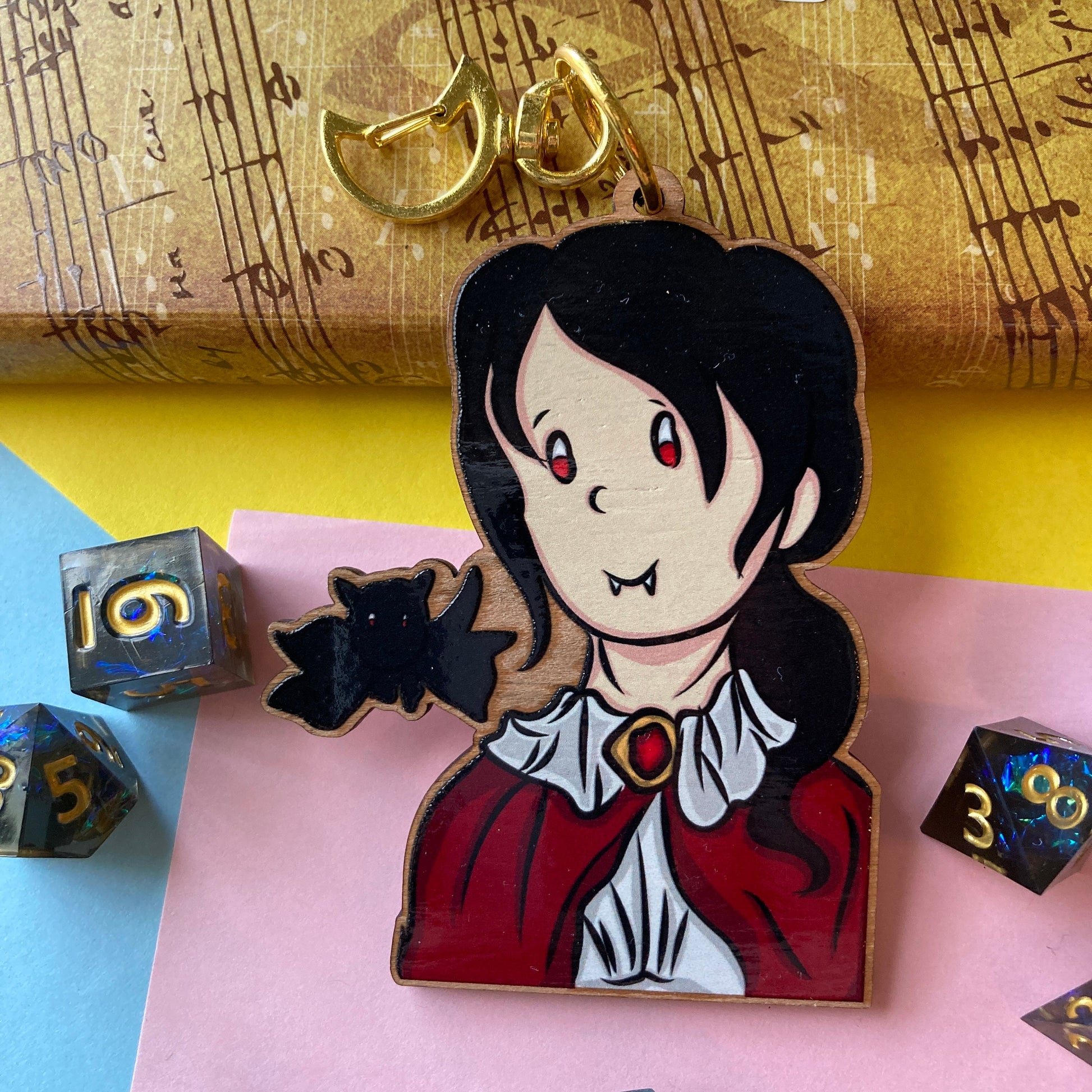 A 3.5" Glossy Cheery Wood Charm featuring a delightfully spooky cute vampire and her little bat friend!